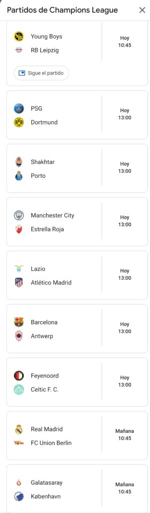 La actividad continuará con seis juegos en los que conjuntos como PSG ante Borussia Dortmund, Shaktar Donestk frente al Oporto, Manchester City en contra del Estrella Roja, Lazio ante Atlético de Madrid, Barcelona en contra del Antwerp y Feyenoord en contra del Celtic FC.