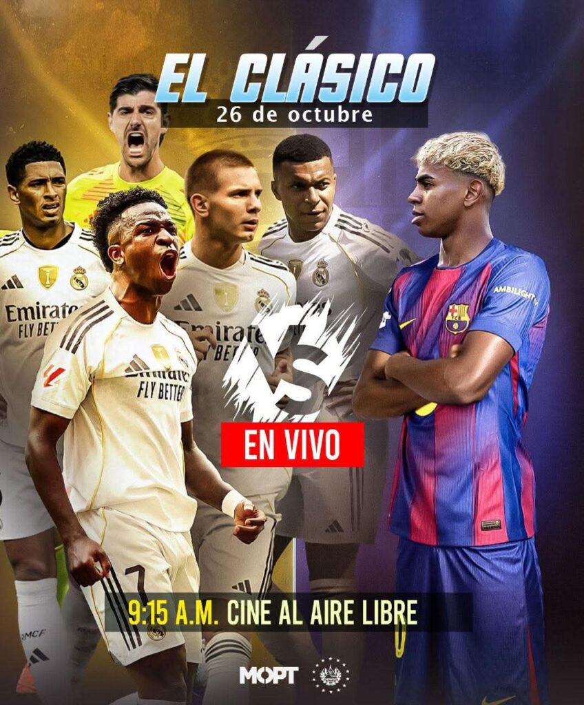 El Ministerio de Obras Públicas (MOP) anunció que este fin de semana los salvadoreños podrán disfrutar del clásico del fútbol español entre Real Madrid y FC Barcelona en el cine al aire libre sobre el bulevar Monseñor Romero y en el Parque de Nuevo Cuscatlán, una iniciativa que busca promover espacios seguros y de sana convivencia familiar.