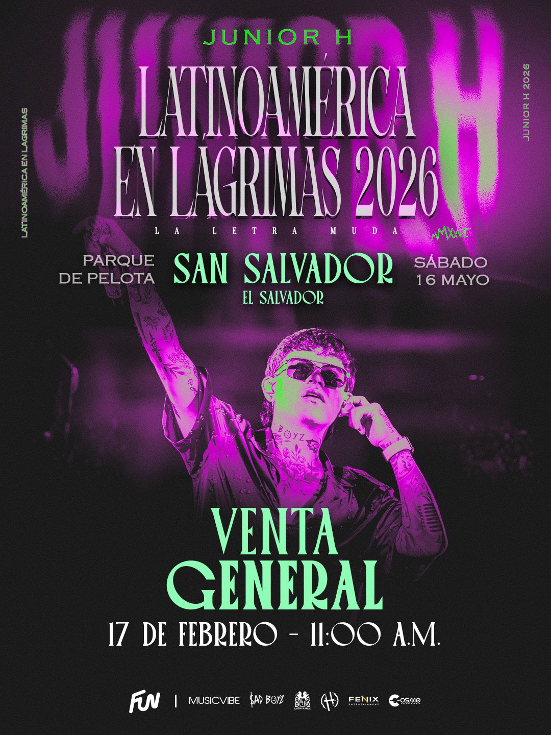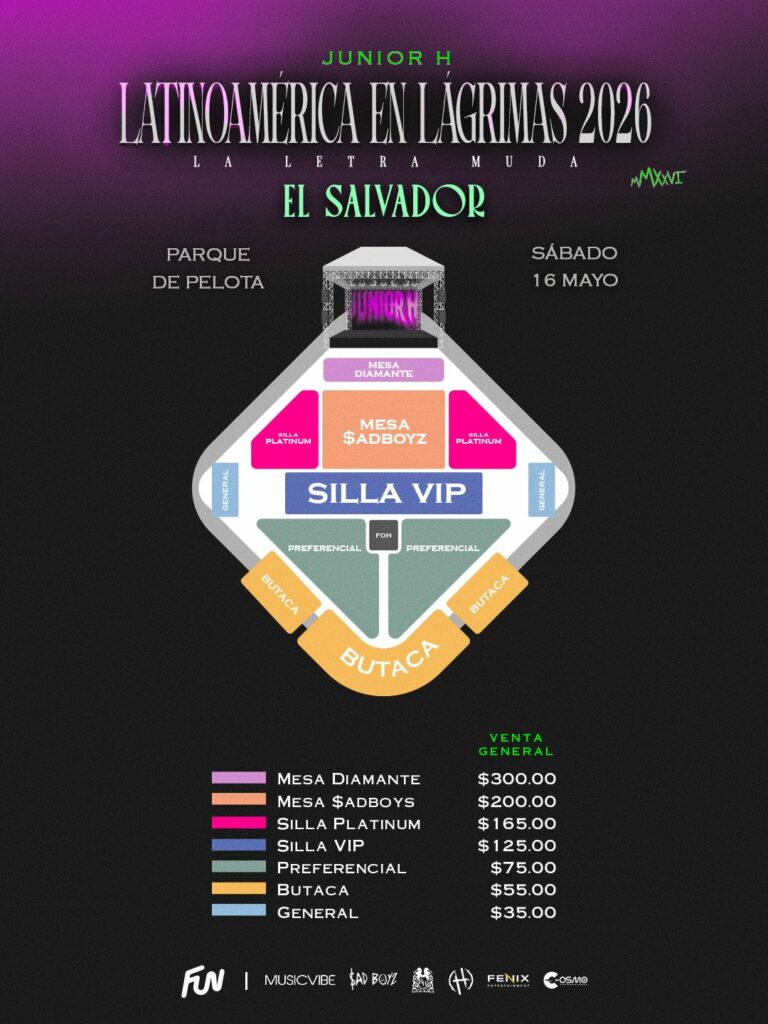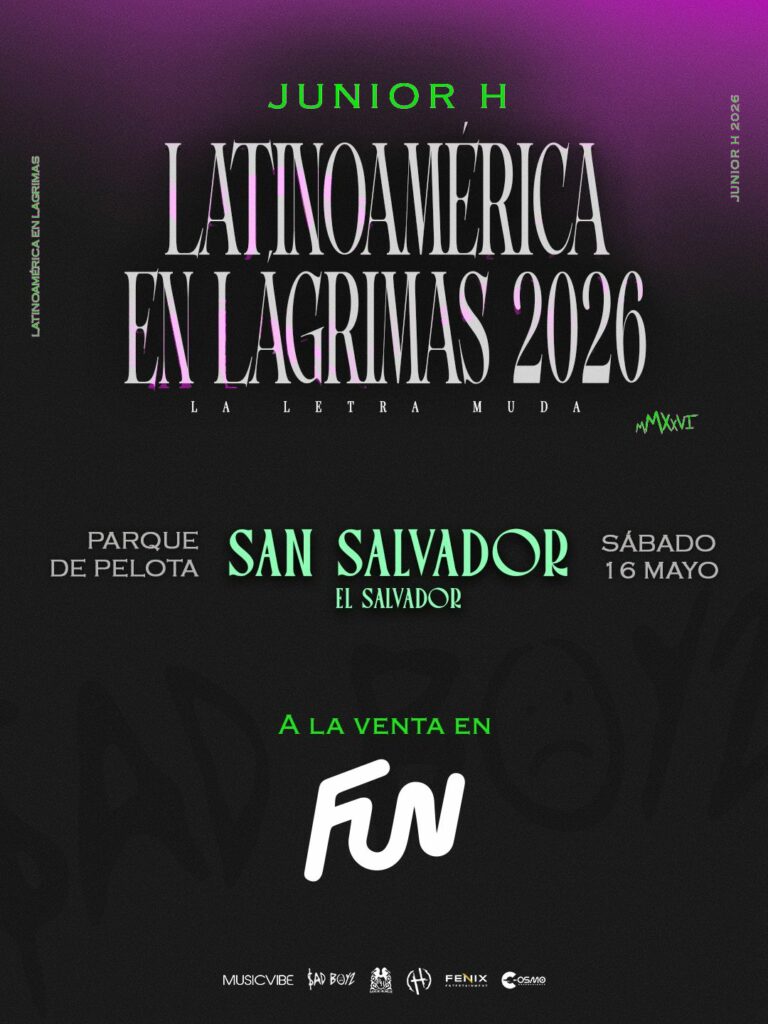 Cosmo producciones anunció esta mañana la venta general de entradas para el concierto del fenómeno global de los corridos tumbados, Junior H, quien confirmó, ayer, su regreso a El Salvador como parte de su gira: «LATINOAMÉRICA EN LÁGRIMAS $AD BOYZ TOUR – LATAM 2026», tras cerrar una de las más exitosas de 2025 en Estados Unidos y México.