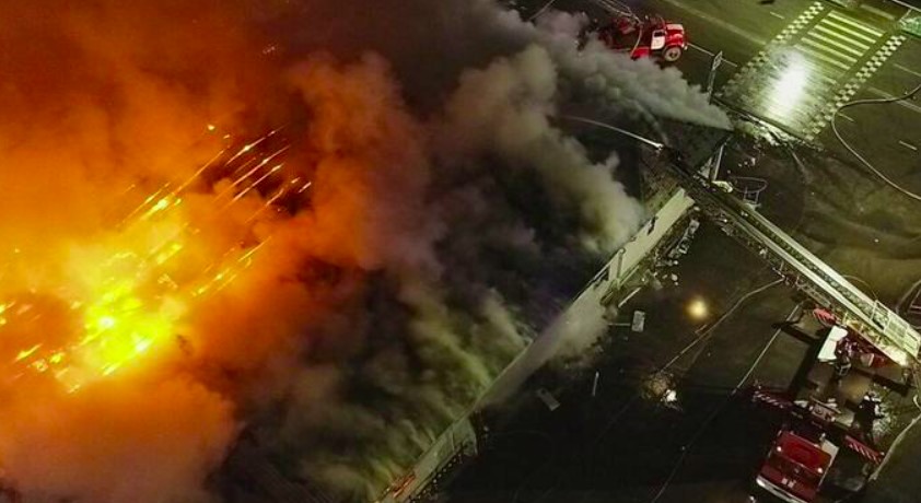 Imágenes de la televisión estatal mostraron a decenas de bomberos y personal de emergencia luchando contra un inmenso incendio que devoraba el edificio de un piso.