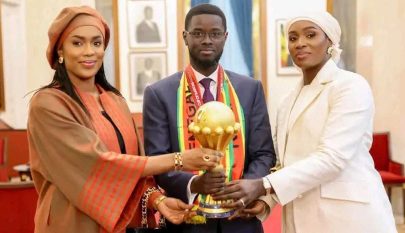 La imagen fue captada durante las celebraciones oficiales tras el triunfo de la selección senegalesa, cuando el mandatario posó con el trofeo acompañado de Marie Khone Faye y Absa Faye, en un evento realizado en el Palacio Presidencial de Dakar.