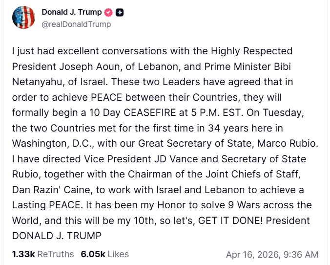 El presidente de Estados Unidos, Donald Trump, anunció este jueves a través de su red social Truth Social que Israel y Líbano acordaron iniciar un alto el fuego de 10 días como parte de un esfuerzo para avanzar hacia la paz en la región.