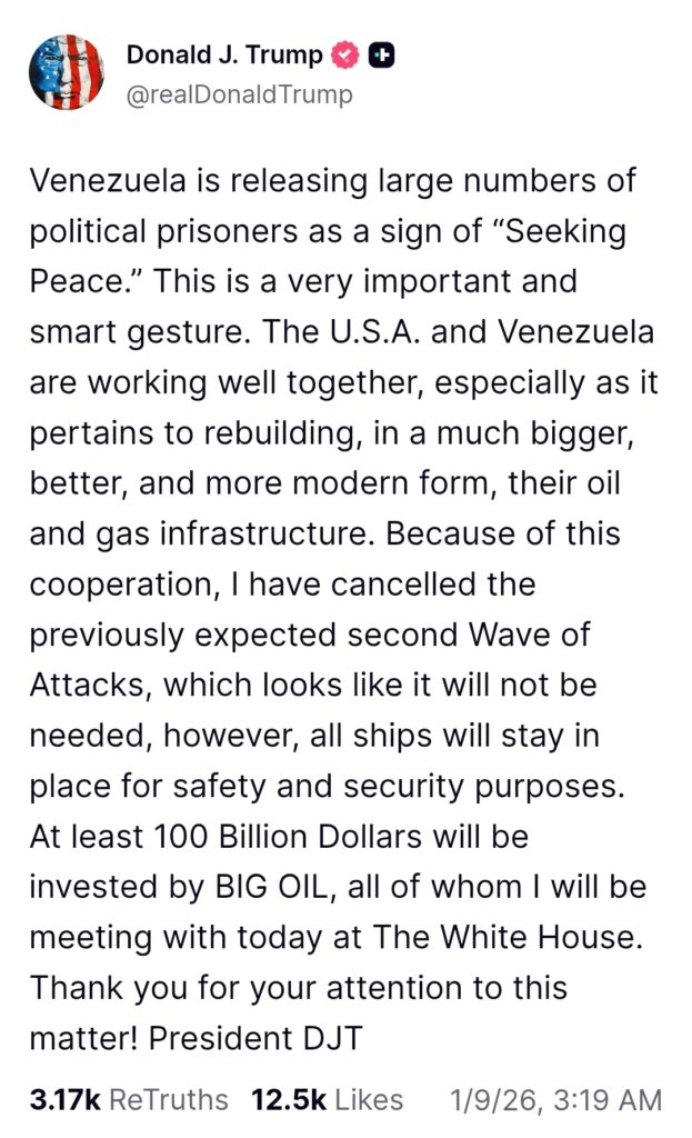 Trump también aseguró que las fuerzas y embarcaciones estadounidenses permanecerán en la región por motivos de seguridad, y adelantó que grandes compañías petroleras invertirán al menos $100 mil millones de dólares en proyectos de modernización energética en Venezuela.