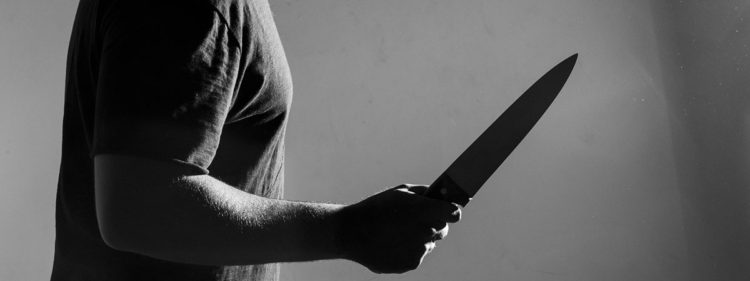 Man in black t-shirt, standing holding a knife. Indoors. Converted to black and white, grain added.