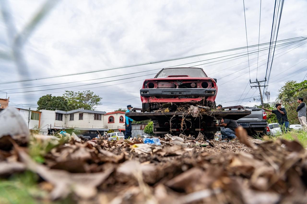 Durante la jornada, equipos municipales intervinieron sectores como la calle al Volcán y la avenida Magisterial, en Mejicanos, donde se retiraron varios vehículos abandonados.