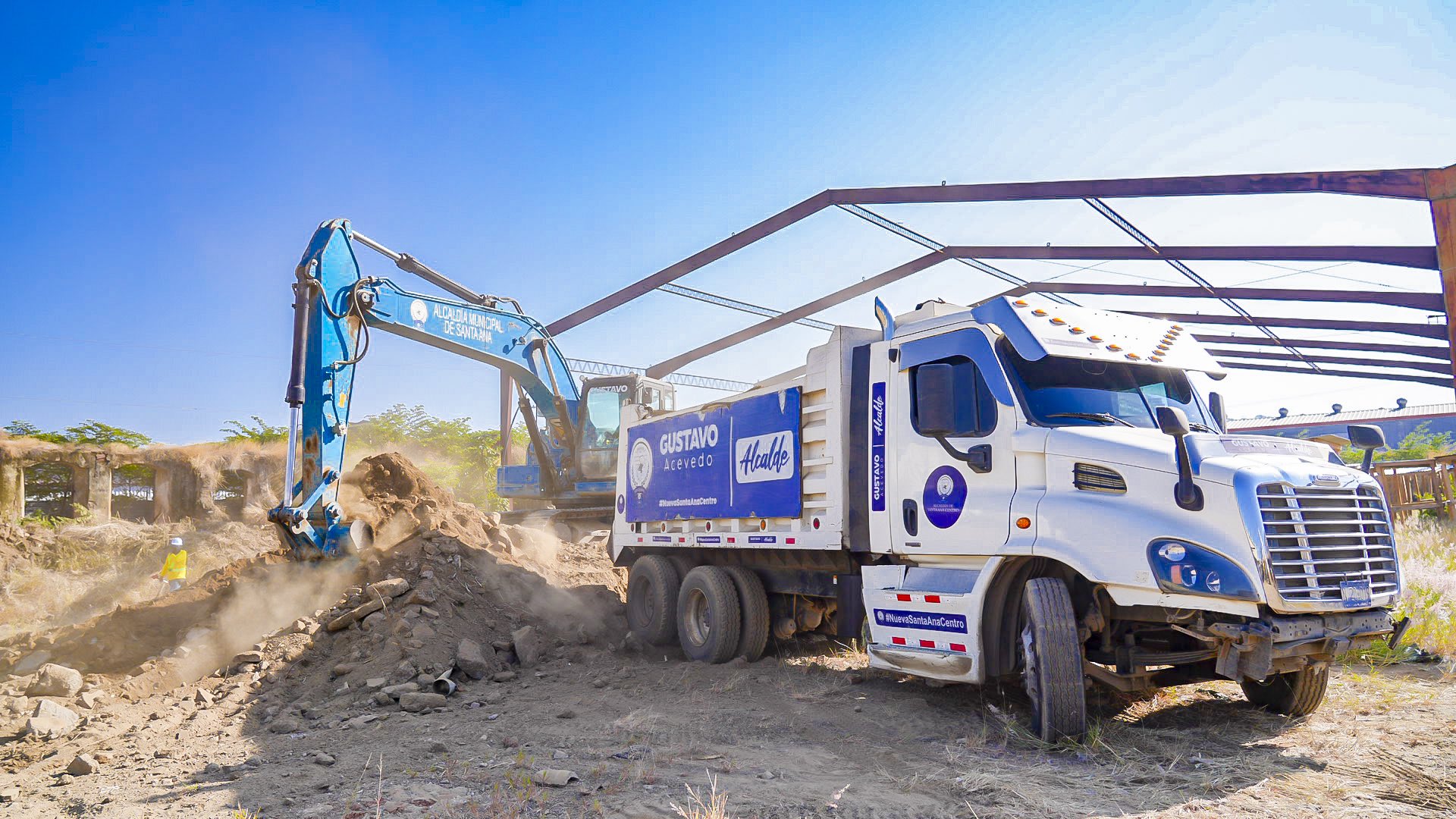 La Alcaldía Municipal de Santa Ana Centro informó este lunes que ha recibido un nuevo lote de maquinaria pesada para intensificar los trabajos de remoción de escombros y nivelación de suelo en el área del Mercado Central, como parte del proyecto de construcción del nuevo Mercado SAC (Mercado de Santa Ana Centro).