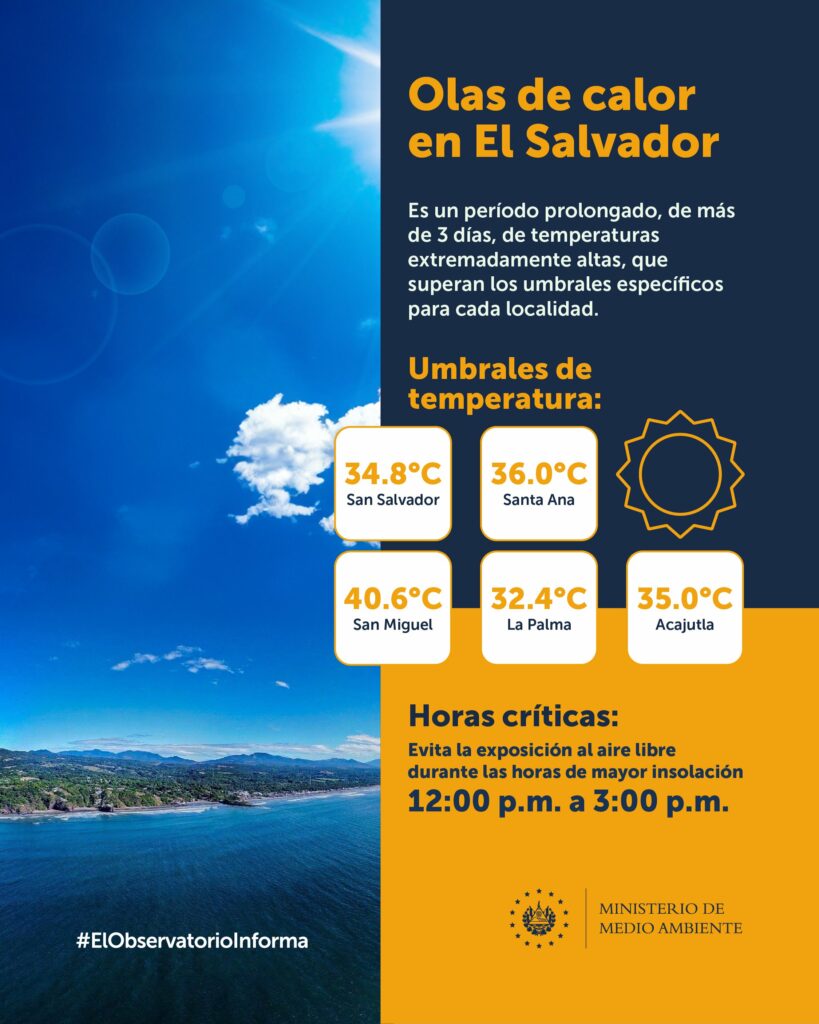 El Ministerio de Medio Ambiente y Recursos Naturales (MARN) informó que El Salvador continúa bajo condiciones de altas temperaturas y elevada sensación térmica, por lo que reiteró el llamado a la población a tomar medidas preventivas para evitar afectaciones a la salud.