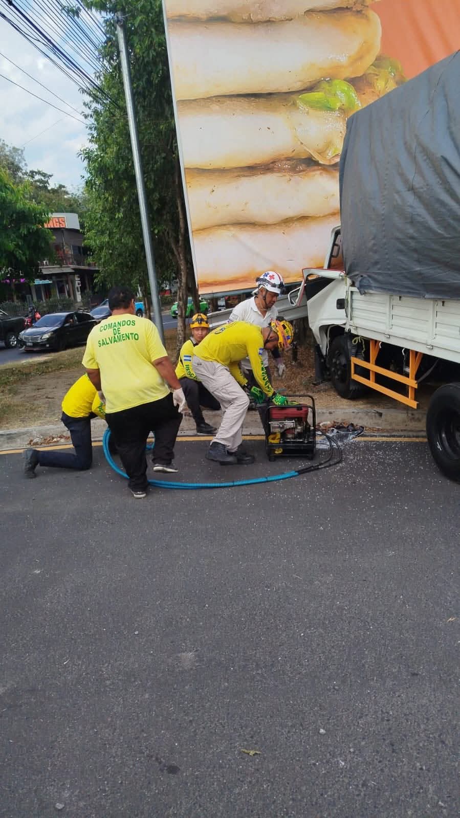 Comandos de Salvamento acudieron al lugar para asistir en la liberación del conductor y gestores regulan el tráfico vehicular.
