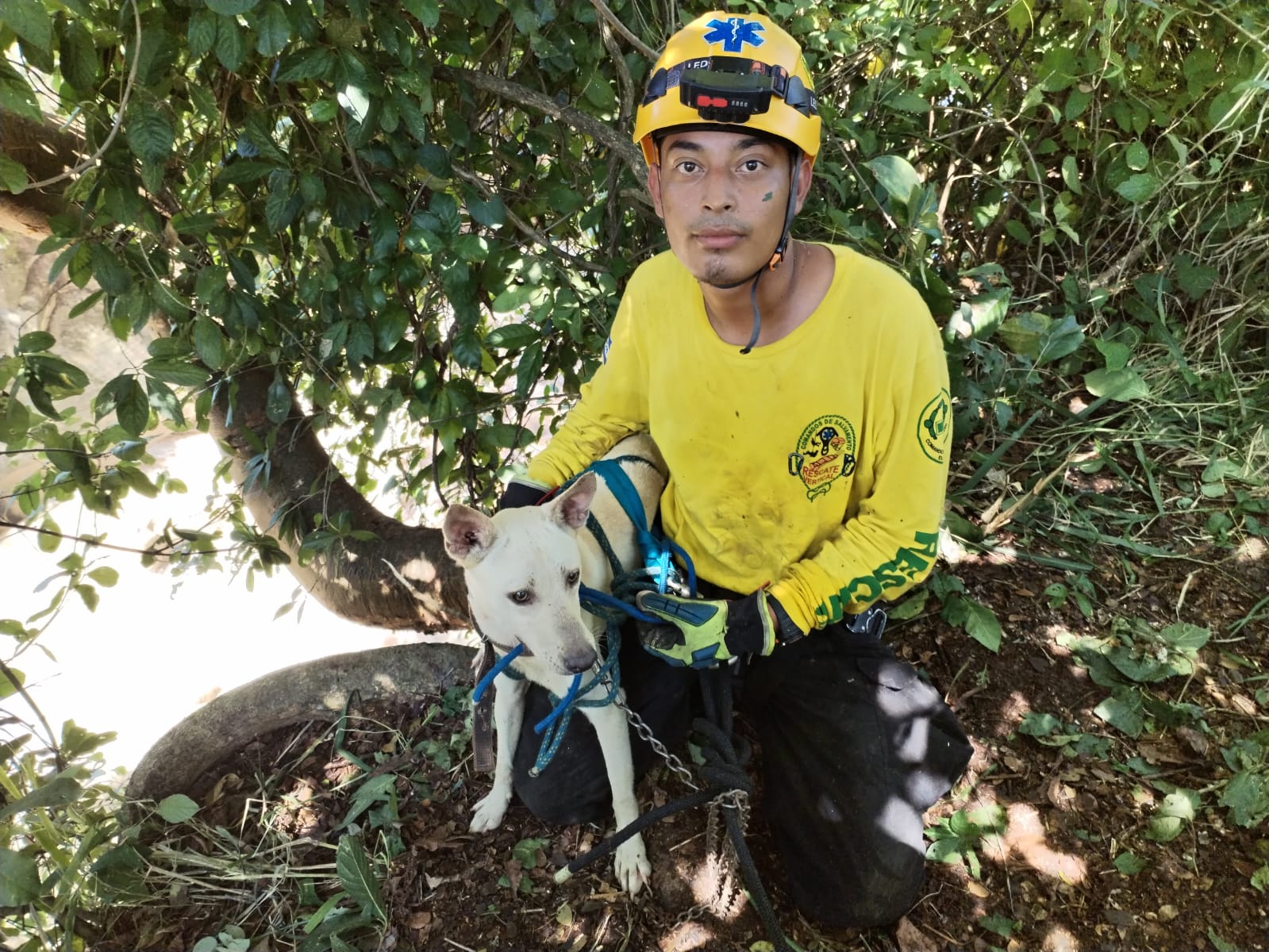 En una valiente operación, personal de Comandos de Salvamento llevó a cabo un rescate vertical para salvar a un perro atrapado en el cauce del río Acelhuate, en la colonia El Porvenir, a la altura del kilómetro 32 de la Troncal del Norte.
