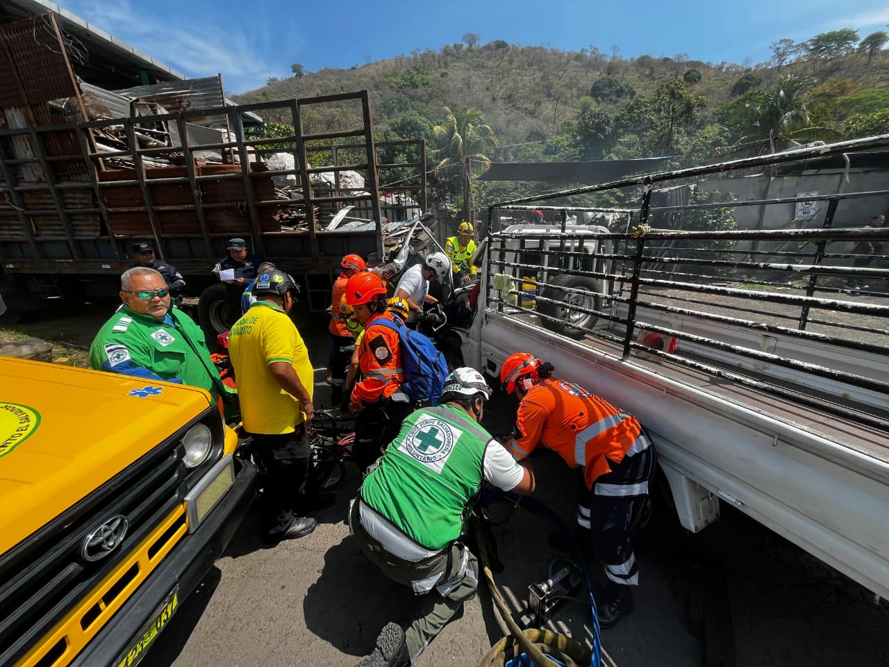 Rescatistas de Cruz Verde Mejicanos, en conjunto con otras instituciones de socorro, y un equipo del Sistema de Emergencias Médicas SEM, acudieron de inmediato al lugar para atender la emergencia. Debido a la gravedad del impacto, fue necesario utilizar equipo hidráulico para lograr la liberación del conductor.
