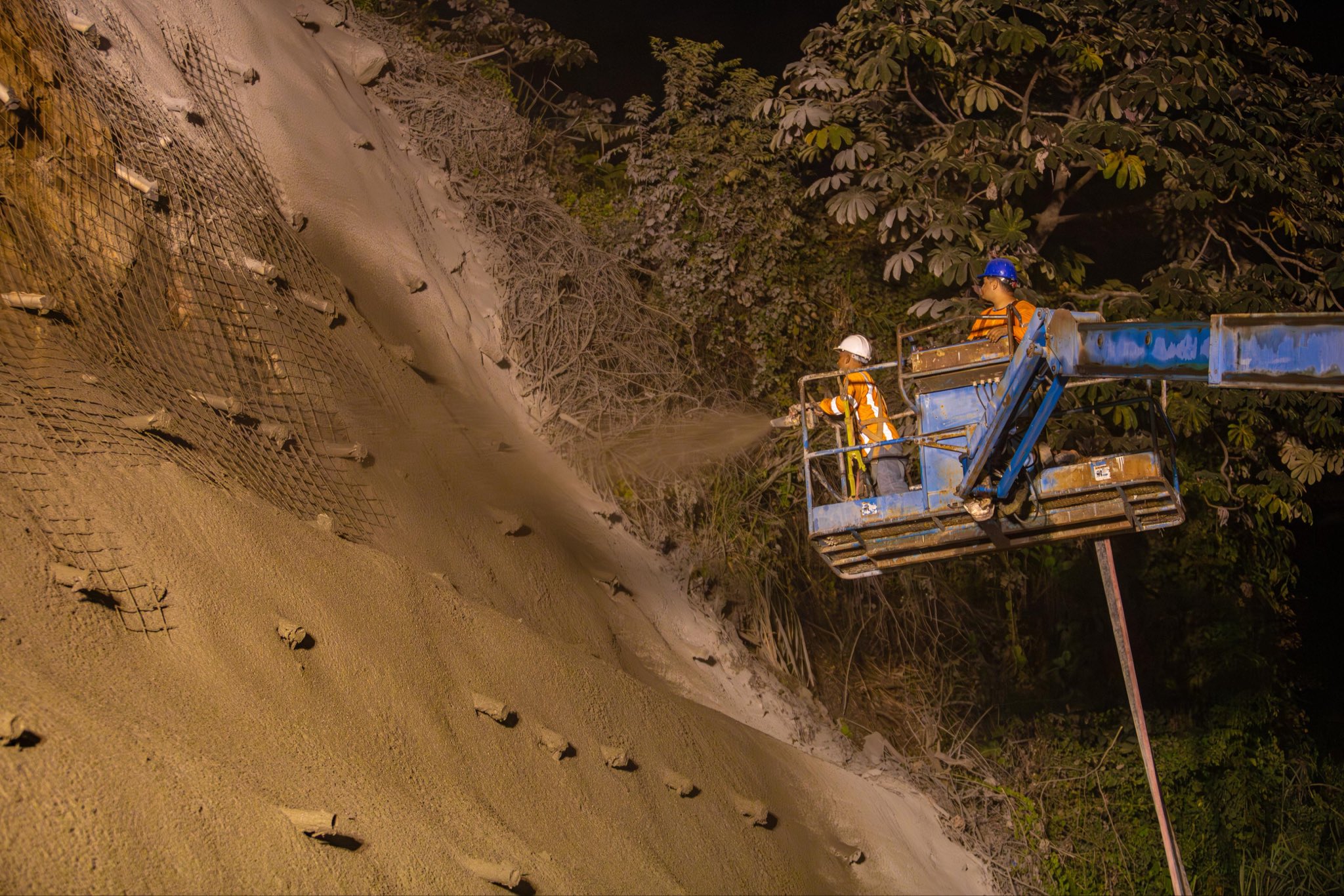 El director ejecutivo de FOVIAL, Alex Beltrán, destacó que los equipos trabajan de forma ininterrumpida para garantizar la seguridad de los salvadoreños. “En la autopista a Comalapa estamos impermeabilizando un talud para seguridad y tranquilidad de los salvadoreños. Estuvimos trabajando esta madrugada y hoy continuaremos estabilizando 1,250 metros cuadrados”, detalló.