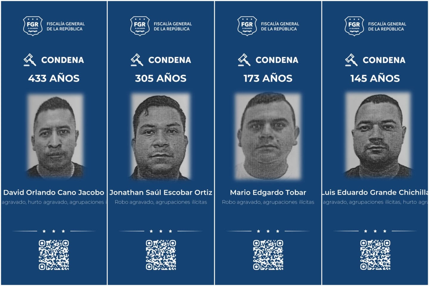 La Fiscalía General de La República de El Salvador (FGR) informó que una estructura delictiva integrada por exagentes policiales y civiles recibió condenas que alcanzan hasta los 433 años de prisión, luego de comprobarse su participación en una serie de robos cometidos entre 2019 y 2022.