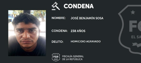 Entre las condenas sobresale la de 238 años en prisión impuesta al sujeto José Benjamín Sosa, por el delito de homicidio agravado. «Con estas condenas se da respuestas a las familias de las víctimas de esta estructura terrorista que operaba en La Unión», asegura la FGR.