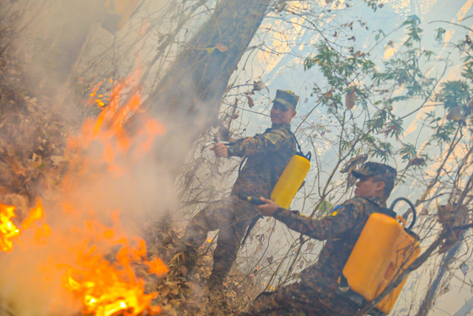 El persona militar desplegado en la zona mantiene esfuerzos para evitar que el incendio se propague en la zona mediante dos UH-1H de la Fuerza Áerea con sistema de descarga de agua, además de los elementos de la Fuerza Armada que se encuentran en el sector.