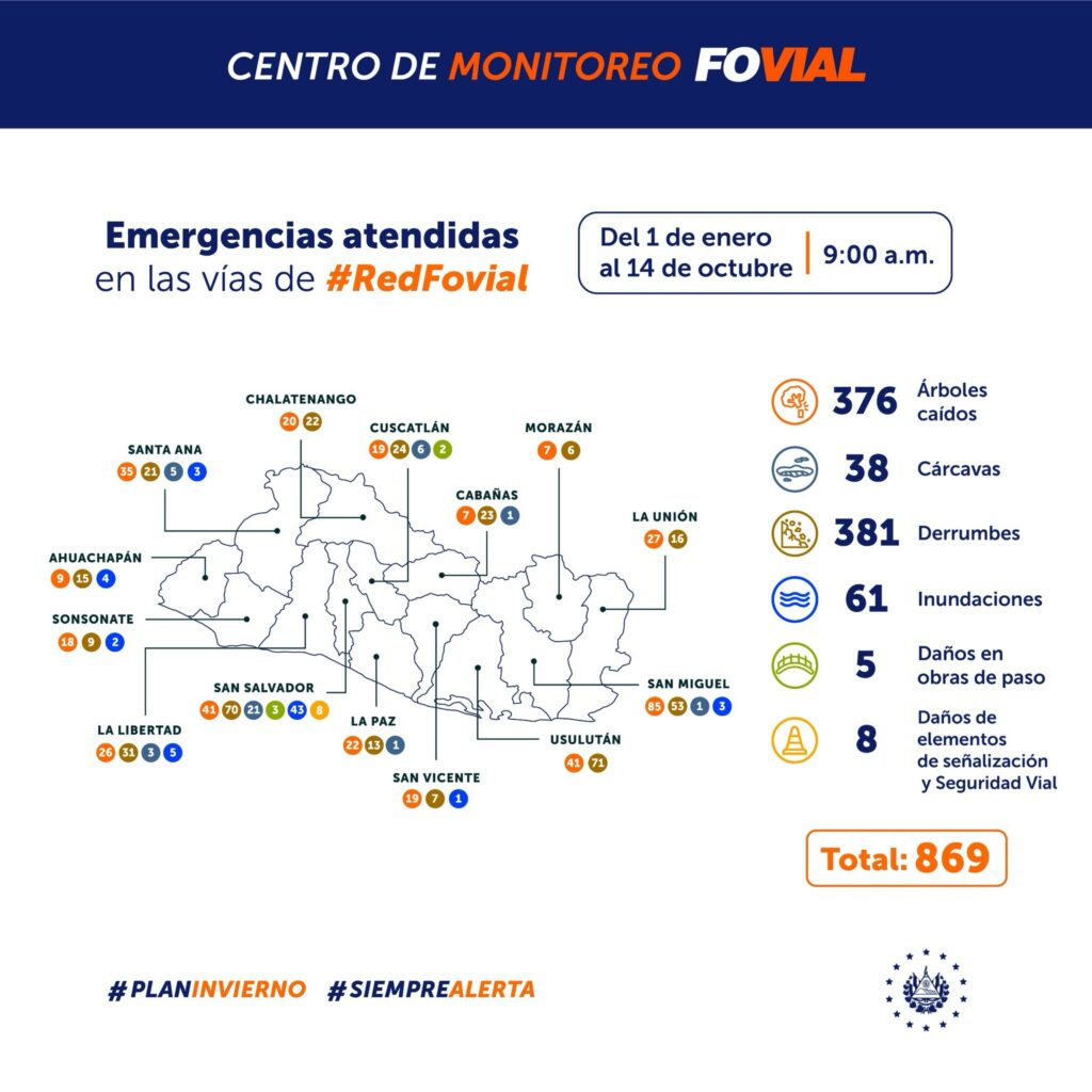 El Centro de Monitoreo FOVIAL informó que, desde el 1 de enero hasta las 9:00 a.m. del 14 de octubre, se han atendido 869 emergencias en la red vial del país, provocadas principalmente por las lluvias que han afectado el territorio nacional.