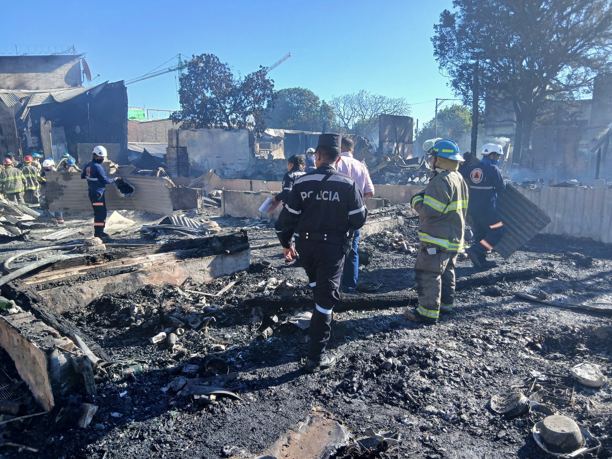 Equipos de Inspecciones Oculares de la Policía trabajan en conjunto con otras instituciones sobre la 6ª Avenida Sur, en el Centro Histórico de San Salvador, donde se originó un incendio durante la madrugada de este día.