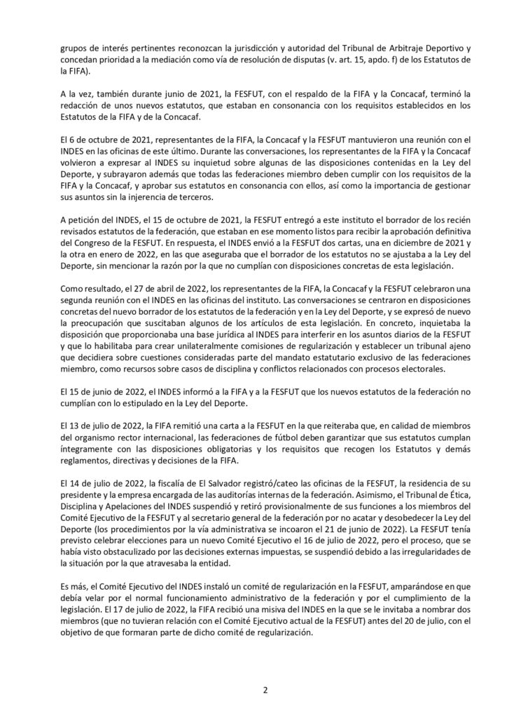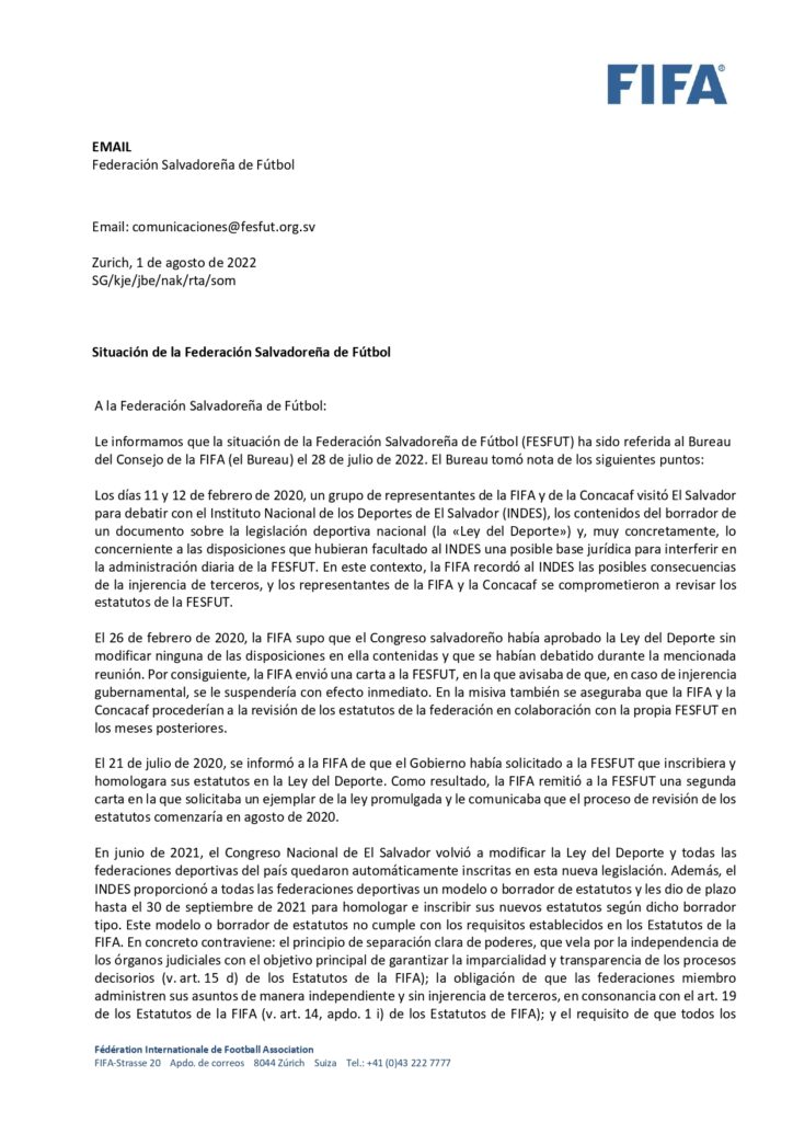 En la carta, la FIFA resume la situación del fútbol salvadoreño que se ha desarrollado en los últimos tres años, con el tema de la Ley General de los Deportes como trasfondo, y admite que «la situación ha creado un vacío de poder en la entidad y una situación de acefalia, por lo que ninguna persona tiene la potestad para tomar decisiones ni poner en marcha ningún mecanismo de gestión.