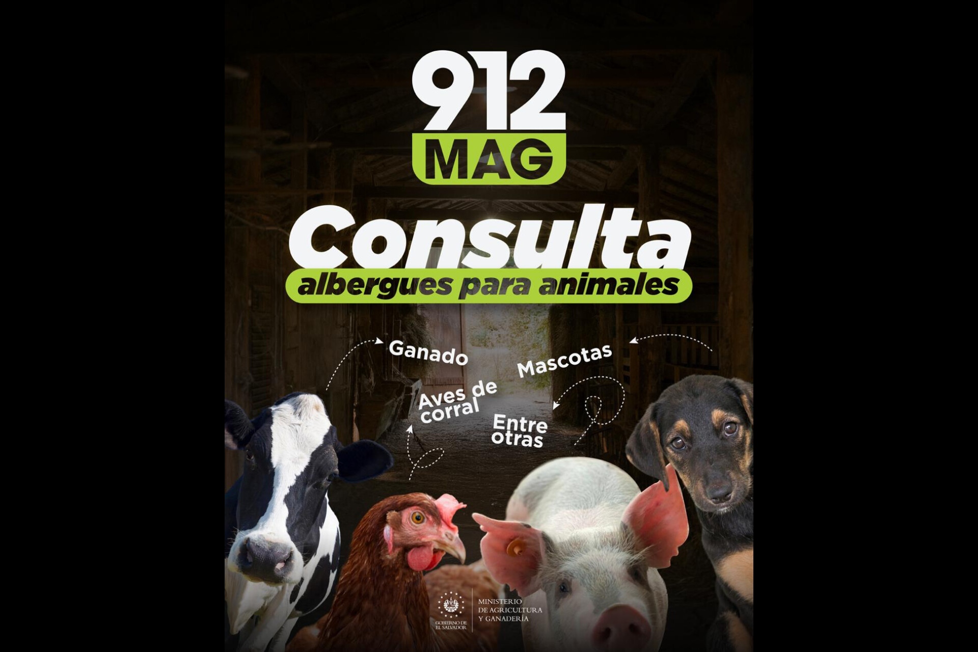 El Ministerio de Agricultura y Ganadería (MAG) informó que los agricultores y familias que necesiten resguardar a sus animales debido a las lluvias pueden comunicarse al #CallCenterMAG912, donde se brindará información sobre los albergues disponibles para su protección.