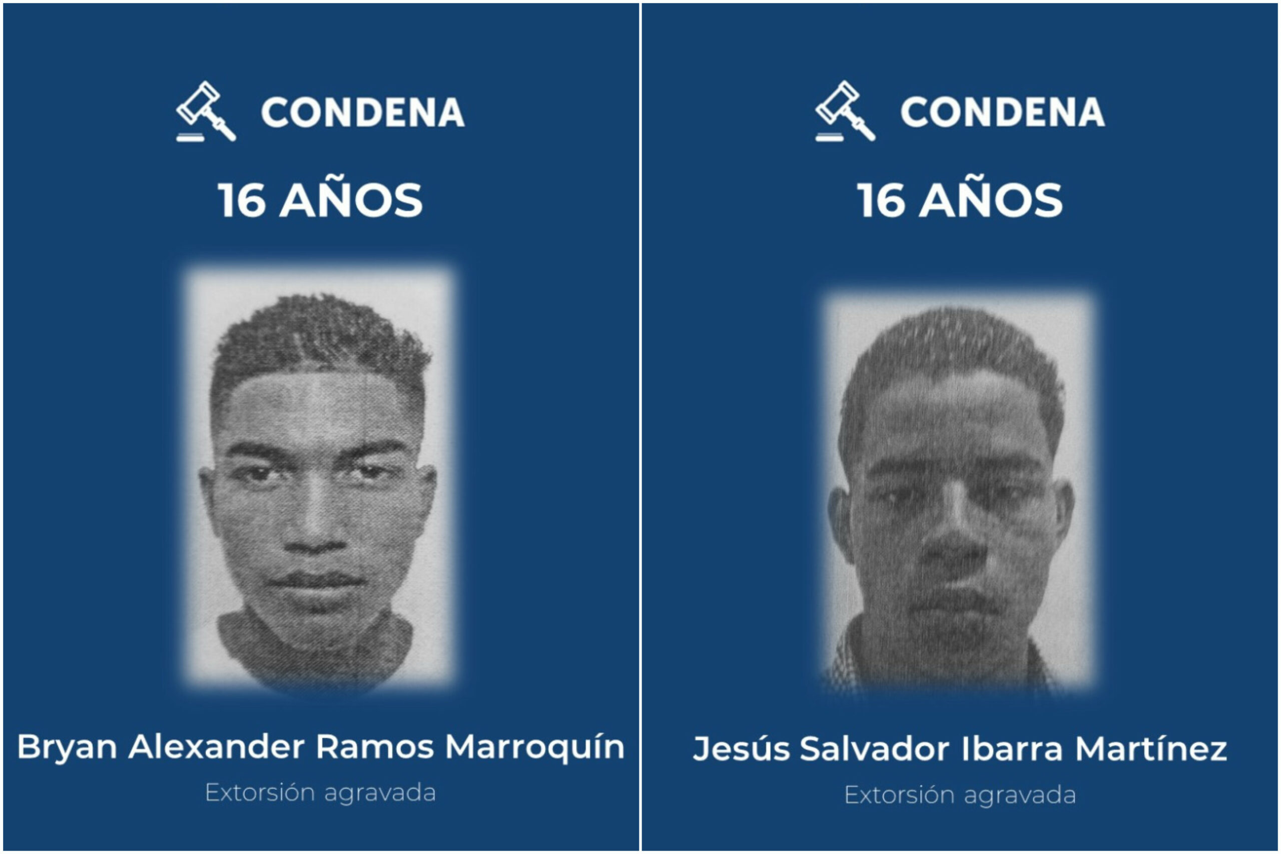La Fiscalía General de la República informó que Bryan Alexander Ramos Marroquín y Jesús Salvador Ibarra fueron condenados a 16 años de prisión, cada uno, tras ser encontrados culpables de extorsionar a una comerciante de Atiquizaya, en Ahuachapán Norte.