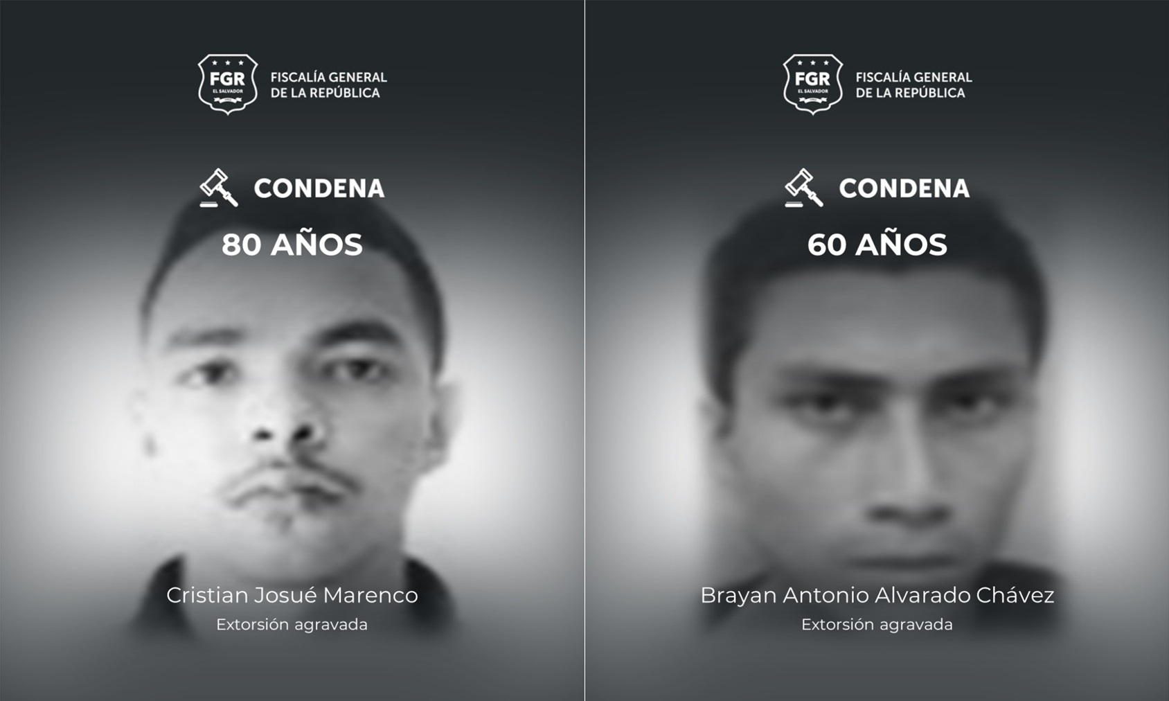 La Fiscalía General de la República (FGR) informó que dos pandilleros fueron condenados a 80 y 60 años de prisión, respectivamente, por el delito de extorsión agravada. Las penas fueron impuestas tras comprobarse la participación de ambos en una estructura criminal que operó durante varios años en el oriente del país.
