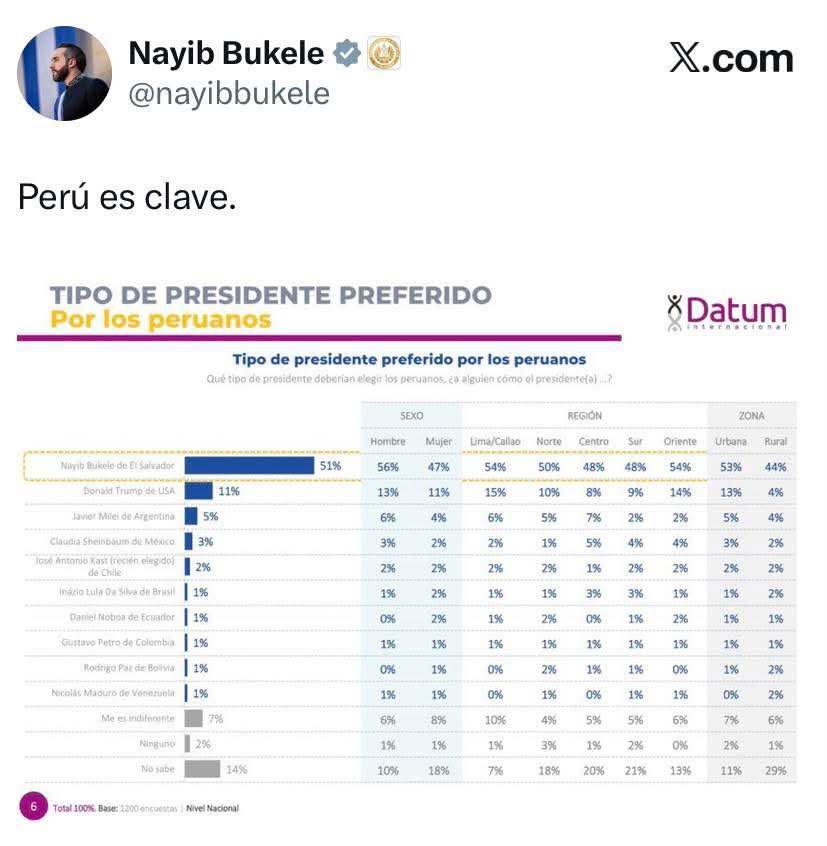 Una reciente encuesta sobre el tipo de presidente que deberían elegir los peruanos coloca al mandatario salvadoreño, Nayib Bukele, como el modelo de liderazgo con mayor respaldo, alcanzando un 51% de preferencia.
