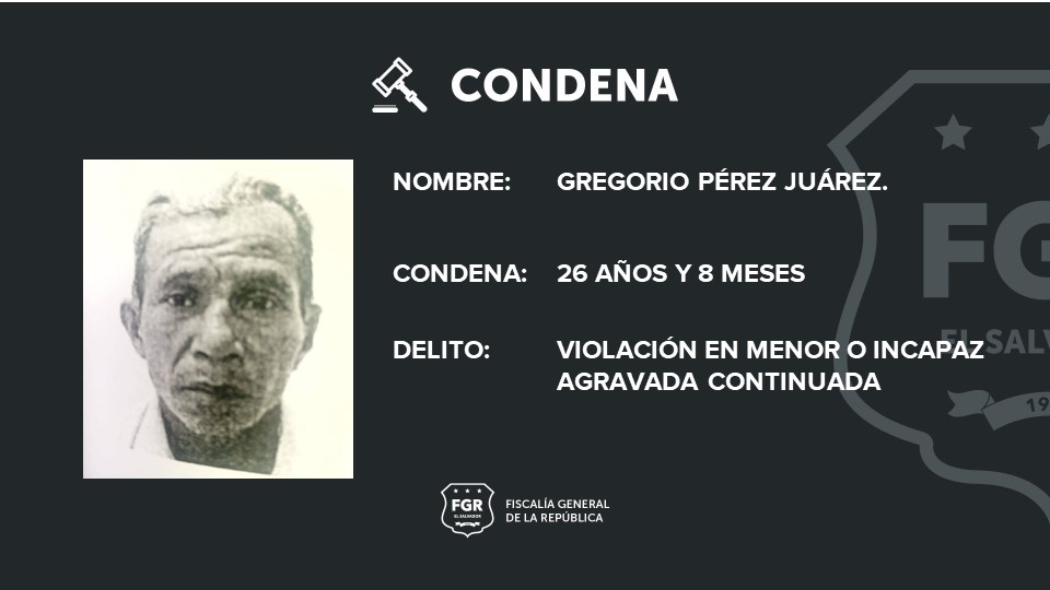 La FGR investigó el caso y obtuvo abundante prueba que fue presentada en la vista pública desarrollada en el Tribunal Primero de Sentencia de Sonsonate y se demostró la culpabilidad de Gregorio Pérez por el delito de violación en menor e incapaz agravada continuada.