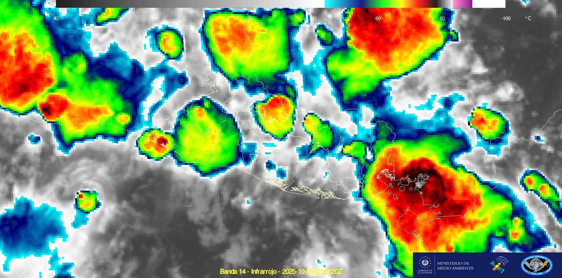 El Ministerio de Medio Ambiente y Recursos Naturales (MARN) informó sobre el pronóstico meteorológico de muy corto plazo, válido desde las 6:00 p.m. hasta las 11:59 p.m. del 5 de octubre de 2025.