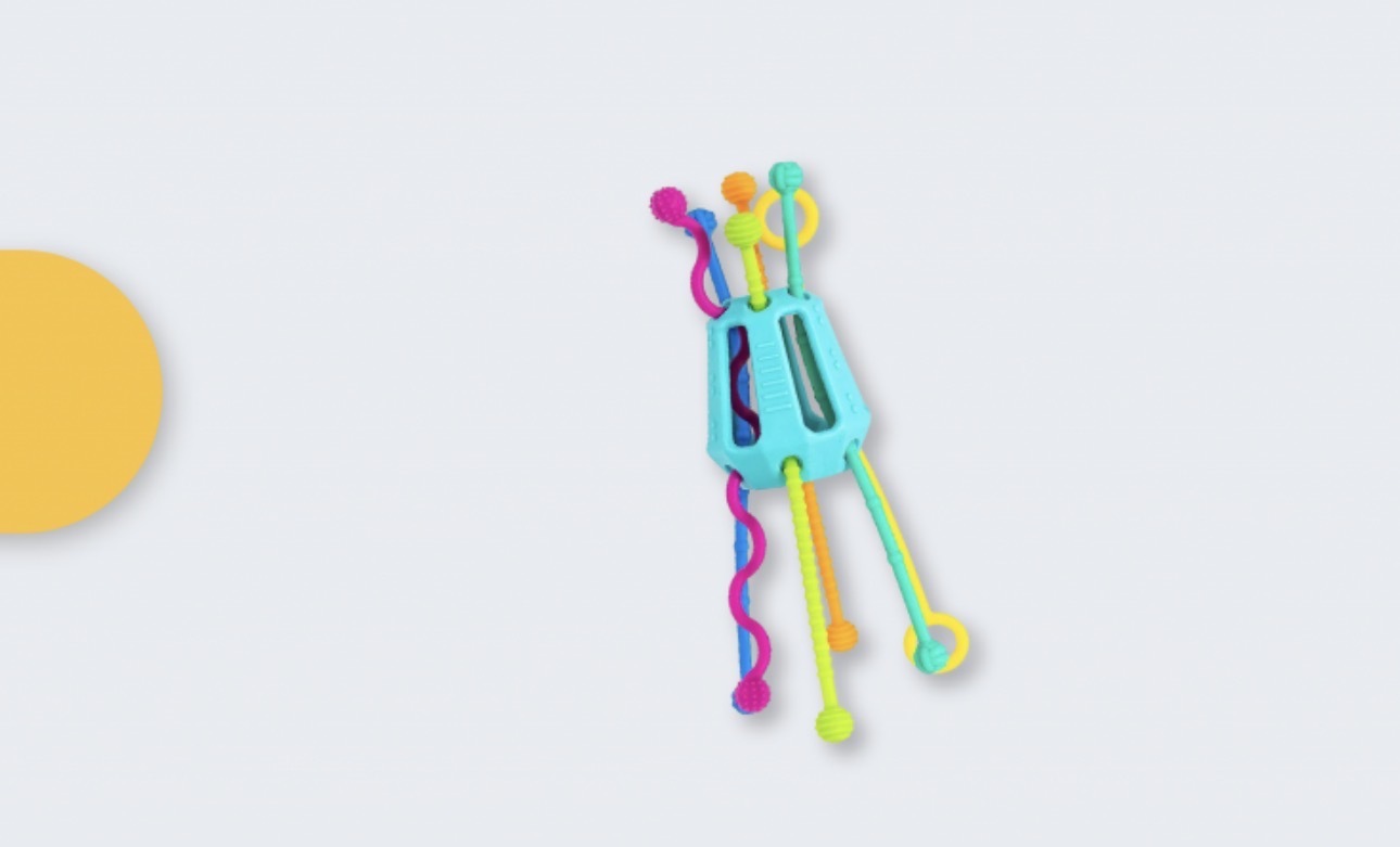 El producto en retiro consiste en un juguete de silicona con un cuerpo cilíndrico flexible de color verde azulado, con orificios por los que atraviesan seis cuerdas de silicona de distintos colores. Cinco de estas cuerdas cuentan con una bola esférica sujeta en uno de sus extremos.