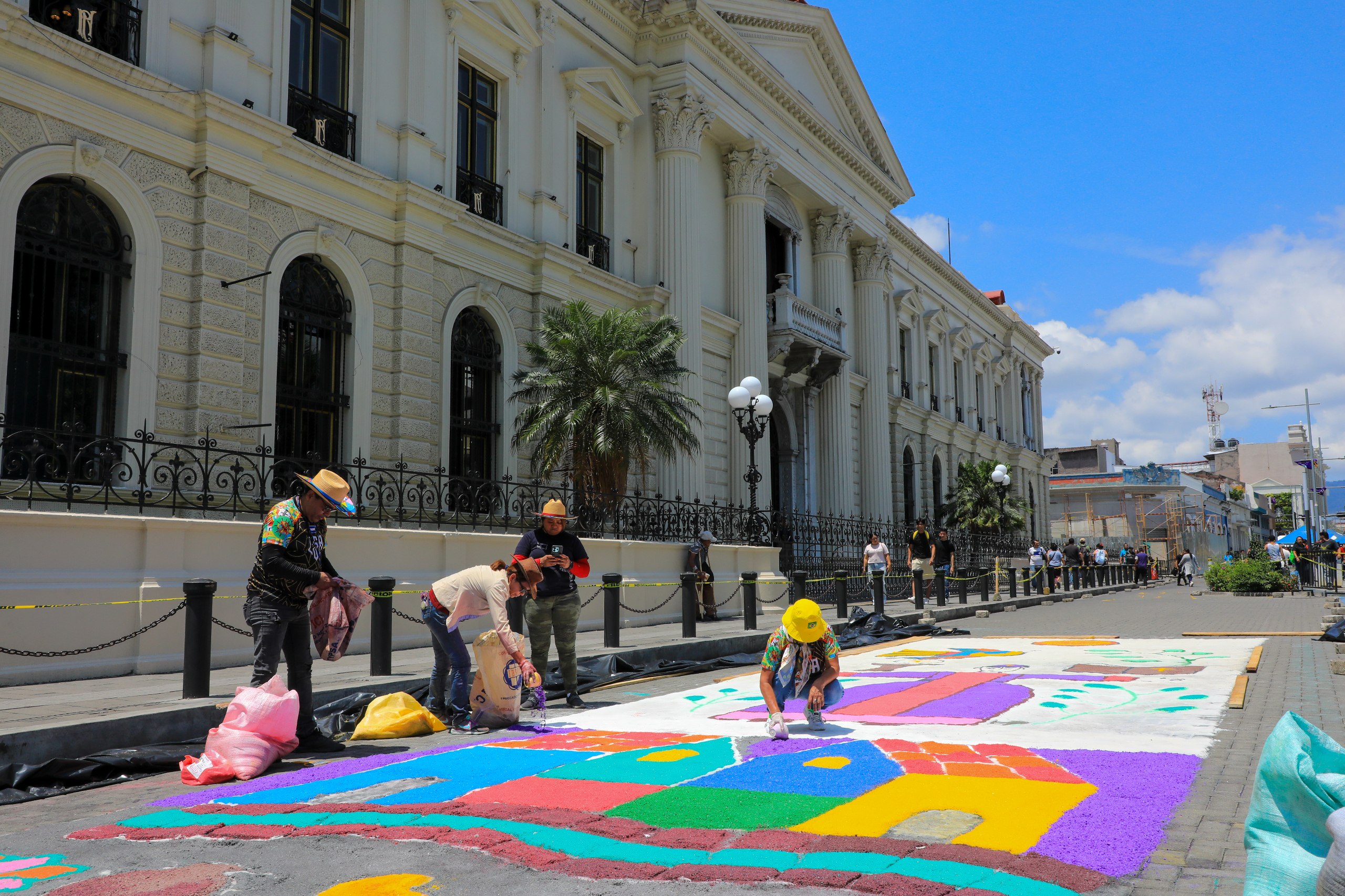 Decenas de salvadoreños trabajan con dedicación en la elaboración de la megaalfombra en el Centro Histórico de San Salvador, una obra que busca estar lista para este Viernes Santo y convertirse en la más grande de toda Centroamérica.