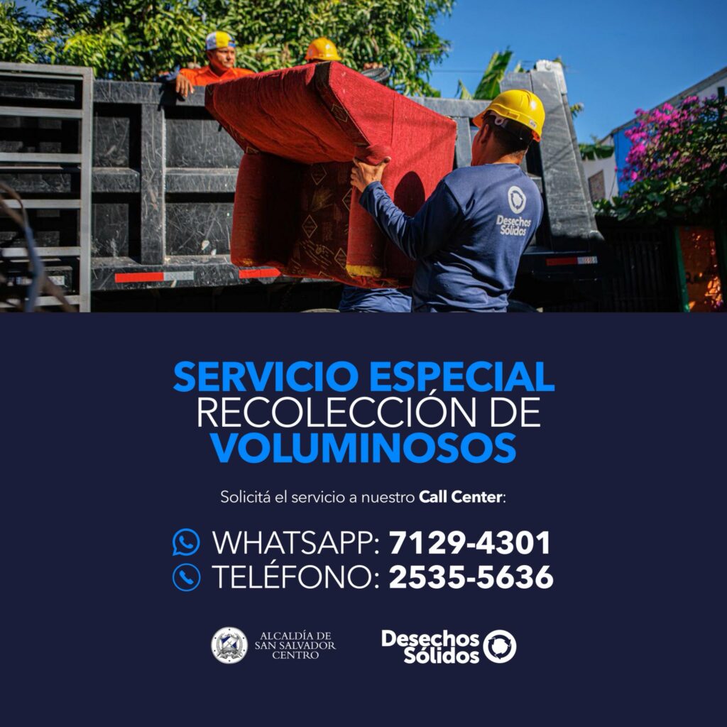 La Alcaldía de San Salvador Centro, en coordinación con el equipo de Desechos Sólidos, ha puesto a disposición de la población un Servicio Especial de Recolección de Voluminosos, con el objetivo de evitar que muebles y electrodomésticos en desuso sean abandonados en calles, quebradas o botaderos clandestinos.