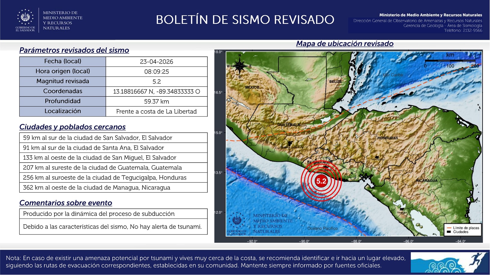 El movimiento telúrico ocurrió a las 08:09:26 y fue percibido en distintas zonas del país. De acuerdo con la actualización, el epicentro se ubicó a 33.0 kilómetros al sur de Playa San Diego, con una profundidad de 59 kilómetros.