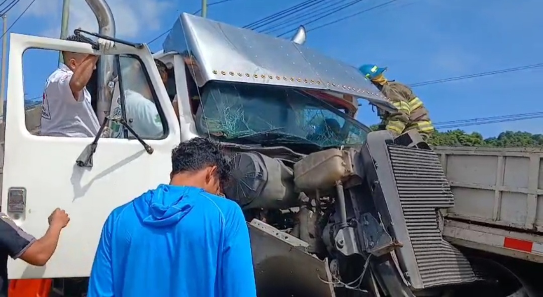 Un aparatoso accidente de tránsito se registró esta tarde en la carretera que conduce de San Salvador hacia el aeropuerto internacional de Comalapa, dejando como saldo al menos una persona atrapada dentro de un vehículo, según reportes de la Cruz Roja Salvadoreña.